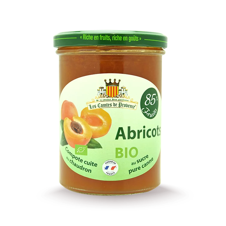 BIO-Aprikosenkompott mit 80% Früchten mit Rohrzucker, im Kupferkessel gekocht.